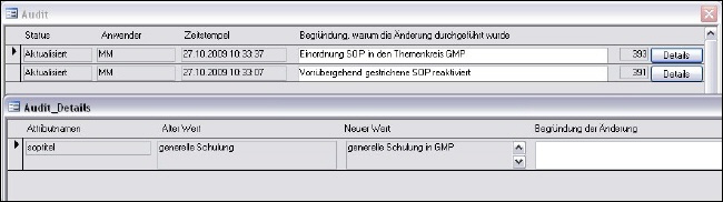 Alle Einträge in die Datenbank unterliegen einem Audittrail, der aus der jeweiligen Dialogmaske heraus sofort über die jeweilige Schaltfläche zugänglich ist. Der Audittrail registriert jeweils die Art der Änderung, welcher Benutzer etwas geändert hat und wann etwas geändert wurde. Die Ausgabe erfolgt in 2 Stufen 1. Wer und wann ein Benutzer einen Datensatz geändert hat 2. Details, welche Änderungen vorgenommen wurden