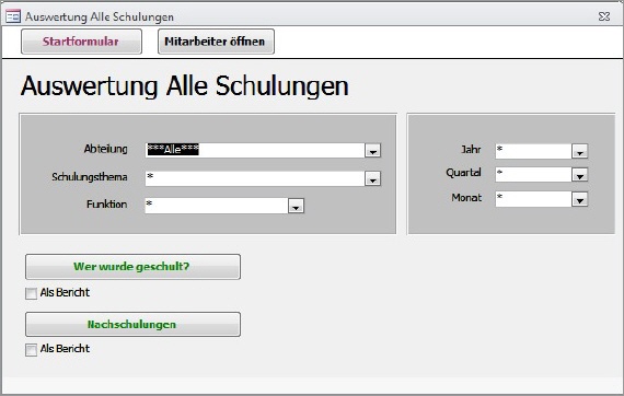 Das Formular Auswertung alle Schulungen ermöglicht eine zusammenfassende Auswertung aller Schulungen mit diversen Filtermöglichkeiten.