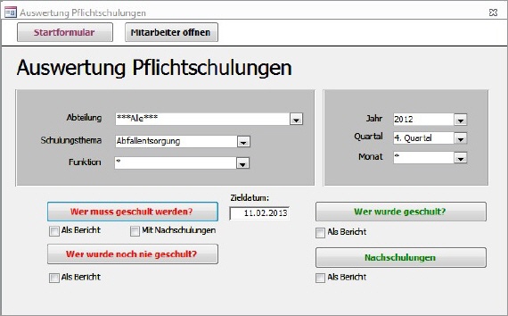 Gesteuert werden die meisten Auswertungen über das Formular Auswertung Pflichtschulungen.