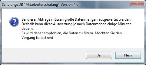 Bedingt durch den rechenintensiven Algorithmus zur Ermittlung der Auswertungen „Wer muss geschult werden?“ oder „Wer wurde noch nie geschult?“ wird beim Klick auf den entsprechenden Button immer folgender Hinweis angezeigt:
