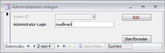 Datenbank-Administratoren haben das Recht, Daten direkt auf Tabellenebene unter Umgehung der vorgegebenen Dialogmasken zu bearbeiten. Normalerweise besteht weder Veranlassung noch Notwendigkeit zu einem solchen Eingriff. Von diesem Recht sollte nur in zwingenden Ausnahmefällen Gebrauch gemacht werden. Es empfiehlt sich stets vor solchen Eingriffen die Backend-Datenbank, welche die Daten enthält, zu sichern.