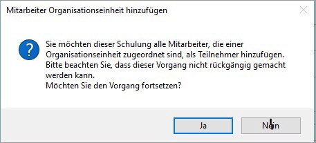 Die Sicherheitsabfrage ist erforderlich, da das Hinzufügen von Mitarbeitern zur Schulung nicht rückggängig bemacht werden kann. Hier hat der User also noch die Möglichkeit, den Vorgang abzubrechen.